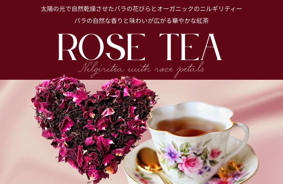 太陽の光で自然乾燥させたバラの花びらとオーガニックのニルギリティーと一緒に混ぜて15時間置きパッキングしました。 バラの自然な香りと味わいが広がる華やかな紅茶です。